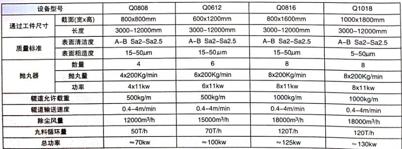 清理室的機動輥道為工件的運載裝置,工件在輥道上前進的同時接收來自不同方位鋼丸的拋射清理,設備采用連續通過式作業方式,廣泛應用于鋼結構、石化、起重機械等機械行業的結構件的拋丸